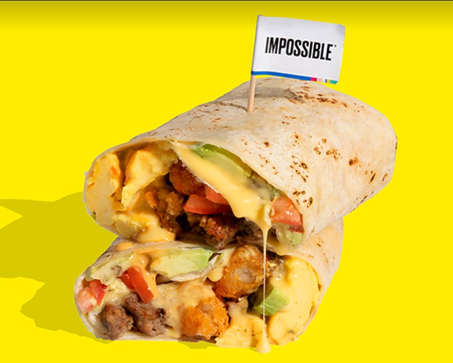 "Wake up and smell the sausage! This burrito has itall! Crumbled Impossible Sausage Made From Plants & plant-based egg, crispy tater tots,tomatoes, avocado, plant-based cheese & spicy veganiase wrapped in a warm tortilla"